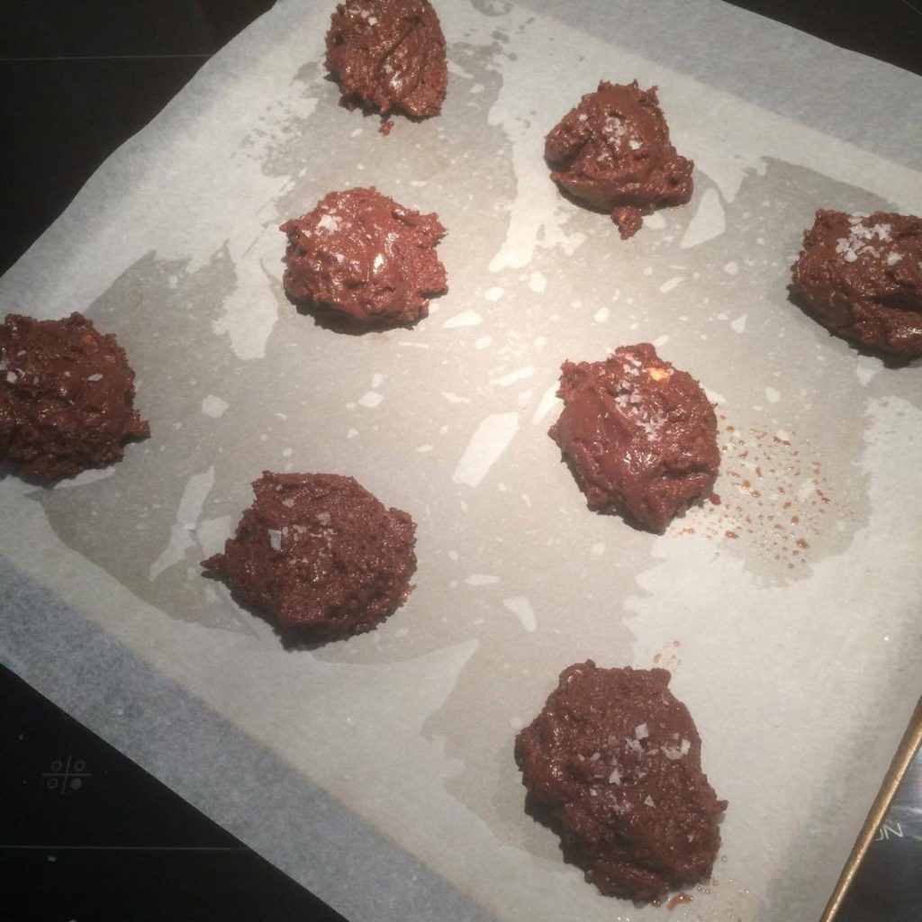 1. Line two baking trays with baking paper. Then place well spaced tablespoons of the cookie dough mixture onto them. Flatten the tops slightly but not completely and sprinkle a little flaky sea salt on each cookie.